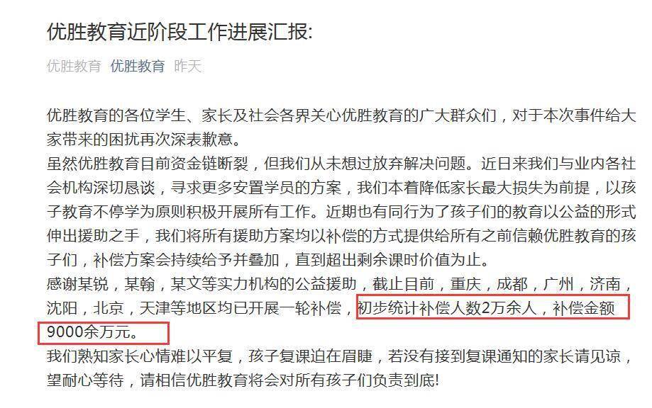 優(yōu)勝教育透露,截至目前,重慶,成都,廣州,濟南,沈陽(yáng),北京,天津等地區均已開(kāi)展一輪補償,初步統計補償人數2萬(wàn)余人,補償金額9000余萬(wàn)元。